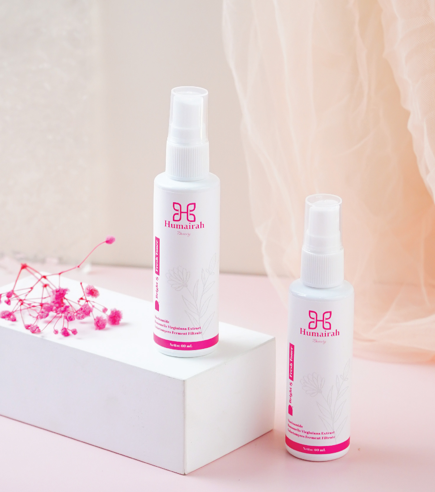 Humairah Bright & Fresh Toner di formulasikan dengan Kandungan Niacinamide, Witch Hazel & Camomile Extract yang dapat membantu memberikan nutrisi pada kulit sehingga kulit lebih terasa lebih segar & halus, serta membantu mencerahkan kulit yang kusam.